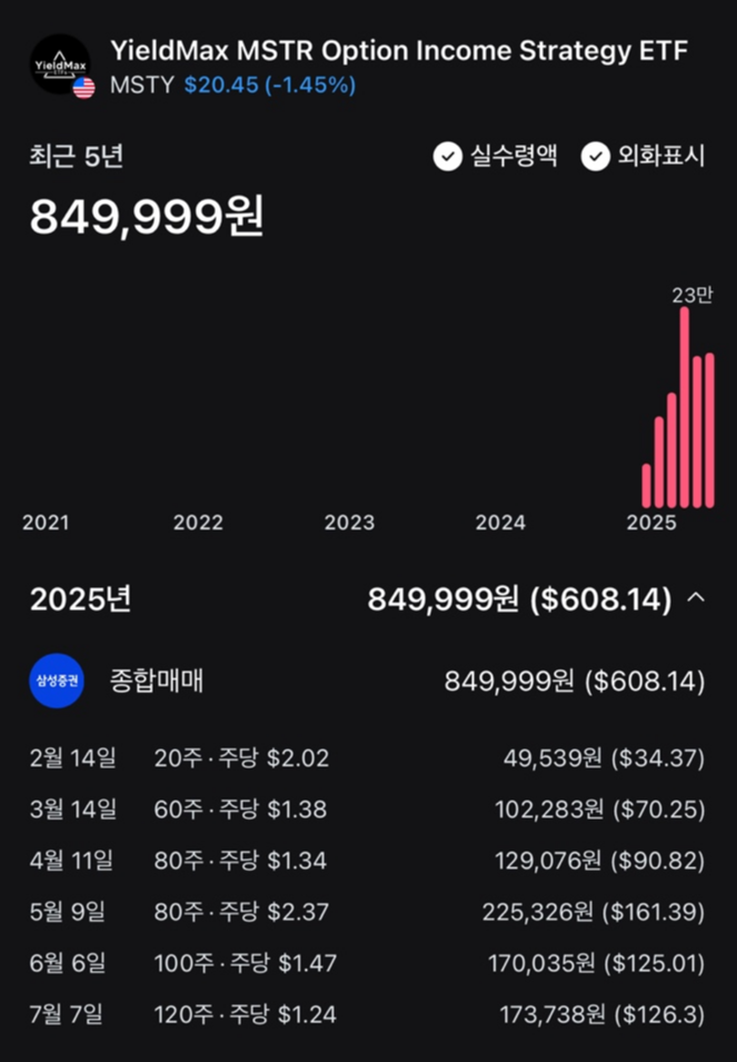 ์ฌํด ๋ค์ด MSTY๋ฅผ ํตํด ์ฝ 85๋ง ์($608)์ ํ๊ธํ๋ฆ์ ํ๋ณดํ์ต๋๋ค.